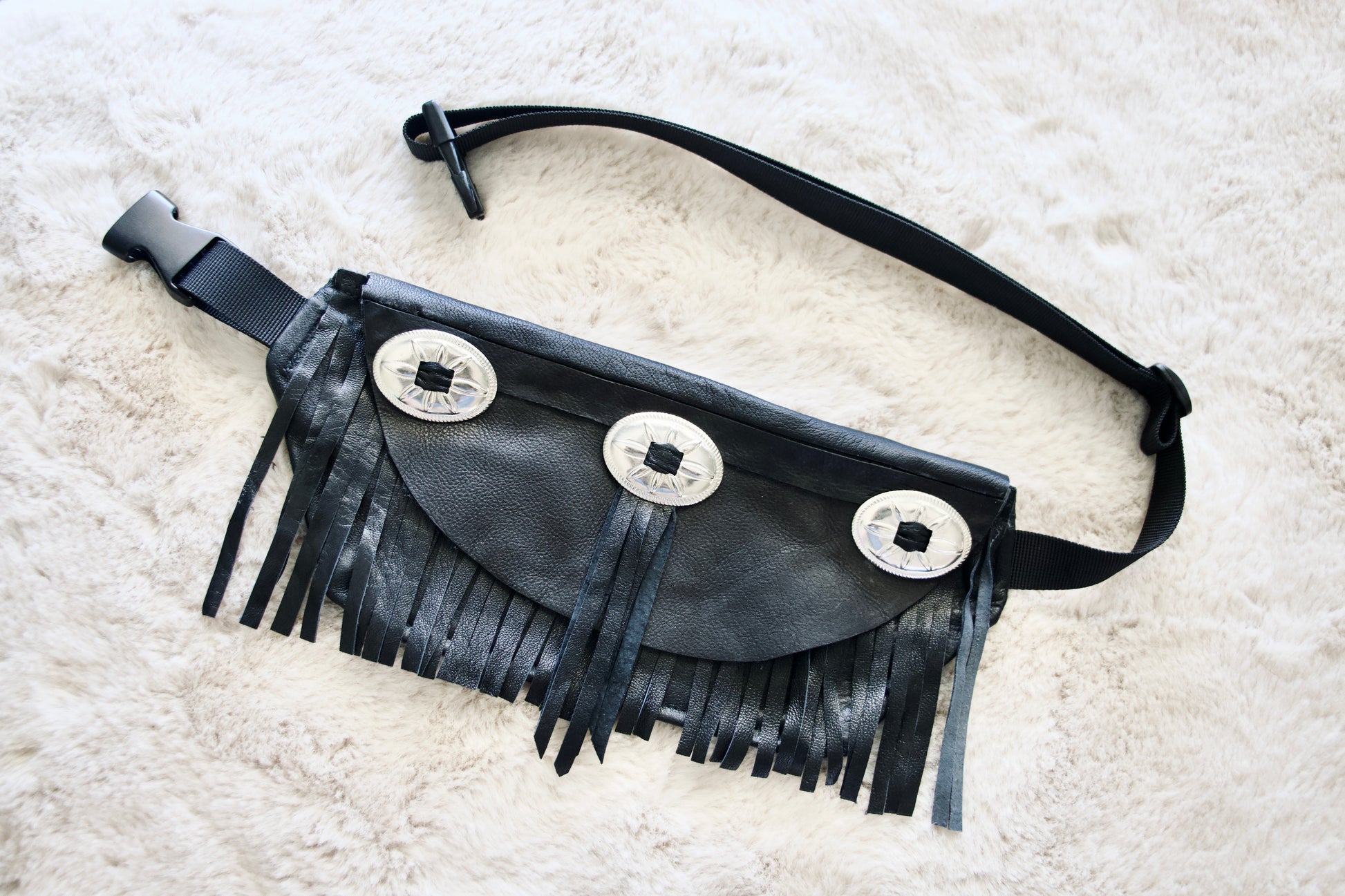 Keep your style without losing practicality with this gorgeous genuine leather fanny pack! Classic adjustable waist band, three nickle plated conchos and lot's of fringe. Snaps to shut. As always, handmade with recycled leather! ♡