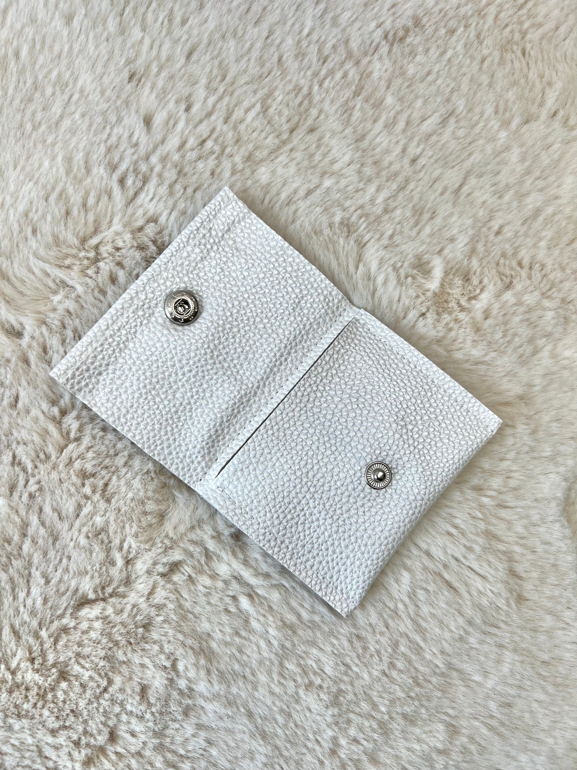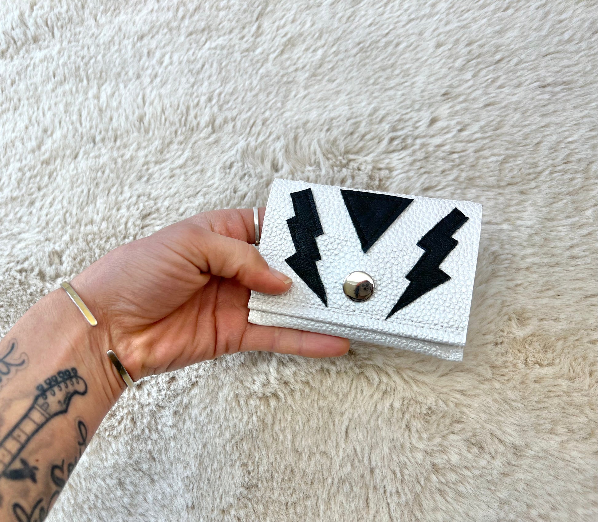 Attract wealth in style with this beautiful, card pouch wallet! Perfect fit for your essential cards and ID when you don't wanna carry a bulky wallet. Sustainably sourced repurposed leather with high quality white vegan leather and embroidered appliqué detail. An industrial snap for closure to ensure secure, accessibility of your essentials. Paired in perfection with our matching White Lightning Clutch with complimentary detail. Great for any occasion whether you're going out on the town, casually shopping or attending a formal event, this wallet and matching clutch are sure to turn heads and compliment any outfit with edgy sophistication. Handmade with love for the eco-chic, fashion forward individual.