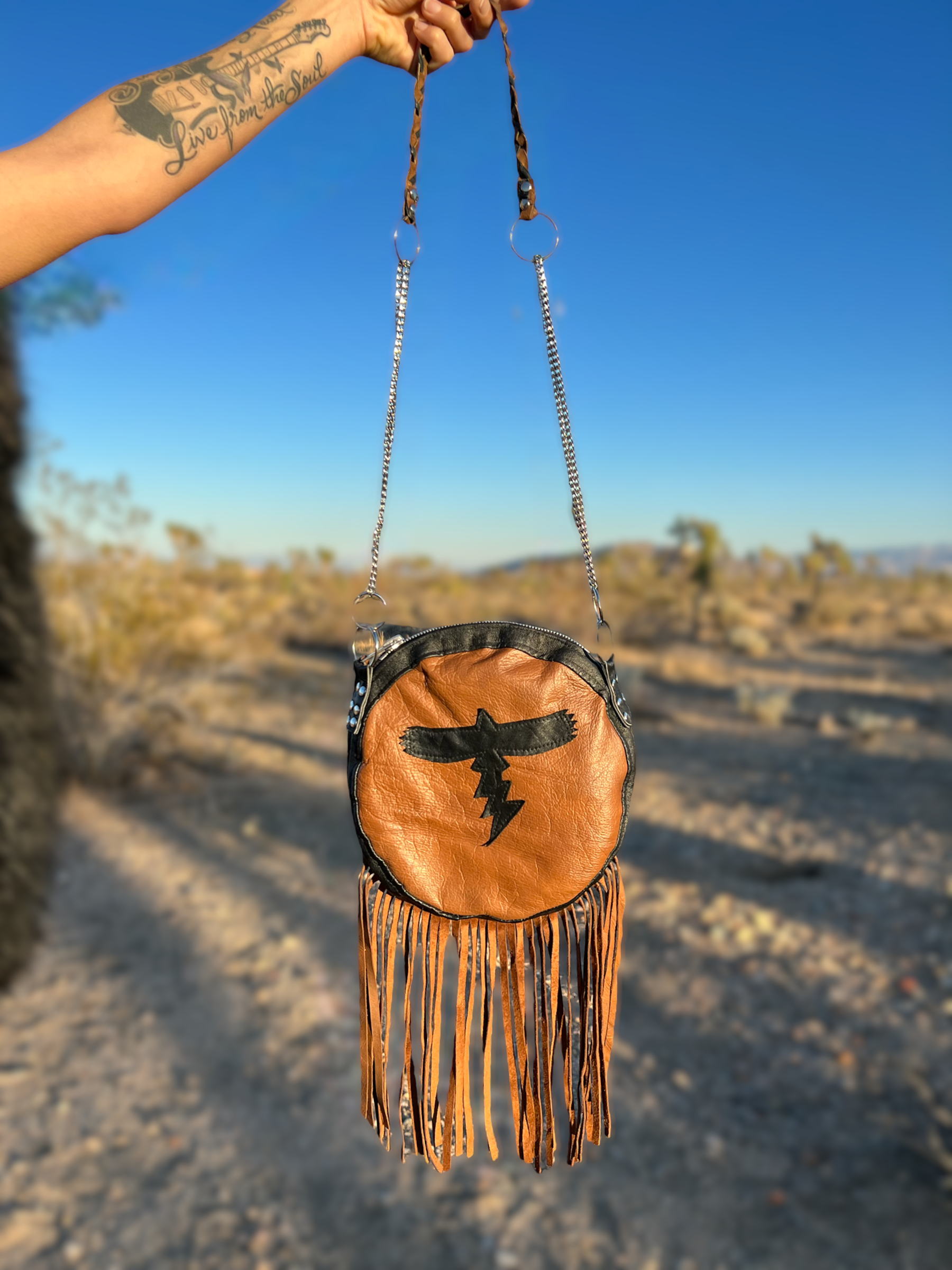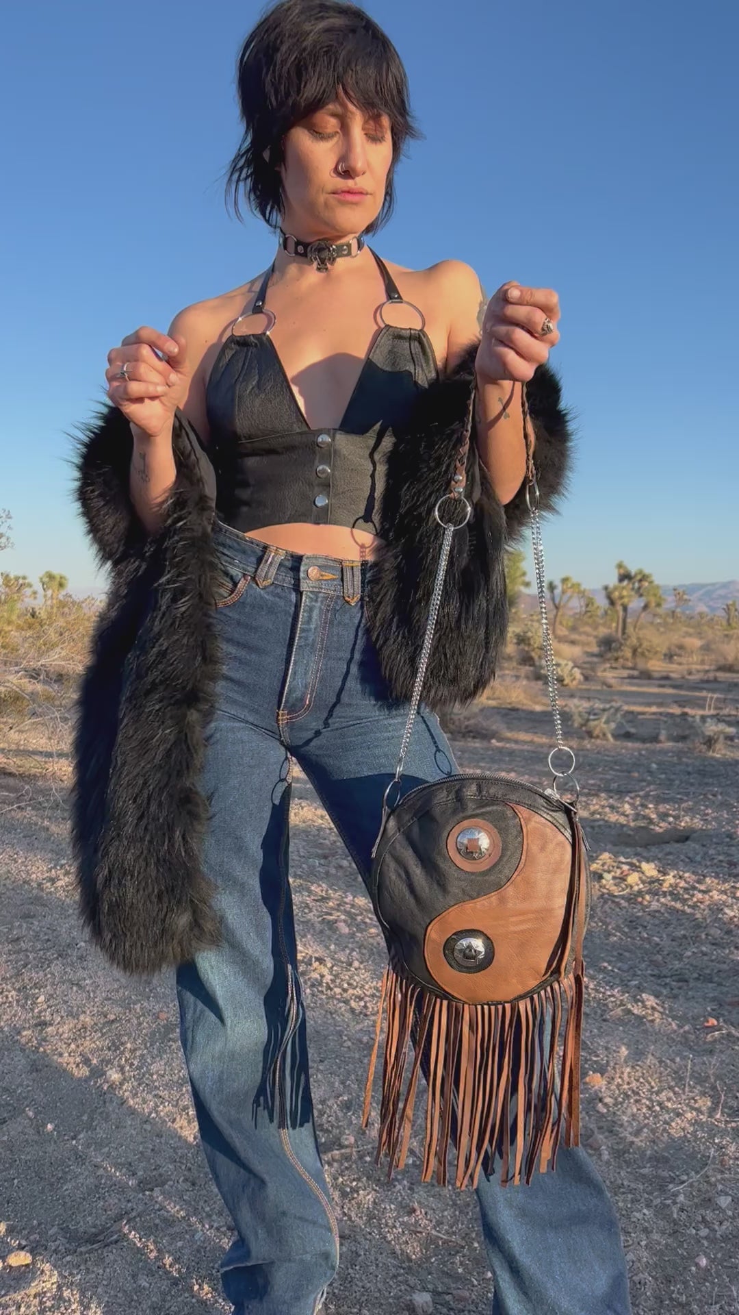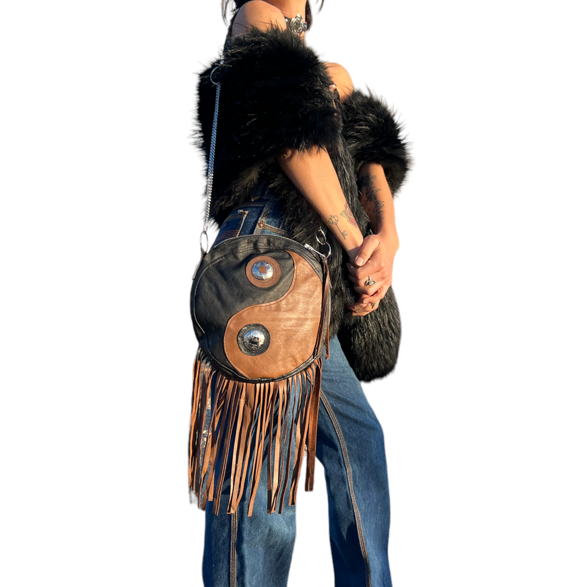 A beautiful, handmade, one of a kind yin-yang, leather handbag! Hand cut detail with brown leather fringe, stunning circular shape with black and brown yin-yang adorned on one side of purse and Punk Rock Hippie leather logo appliqué on the other. Heavy duty zipper and chain with hand braided detailing for the strap and classic metal conchos. Guaranteed to bring balance and style with any outfit!